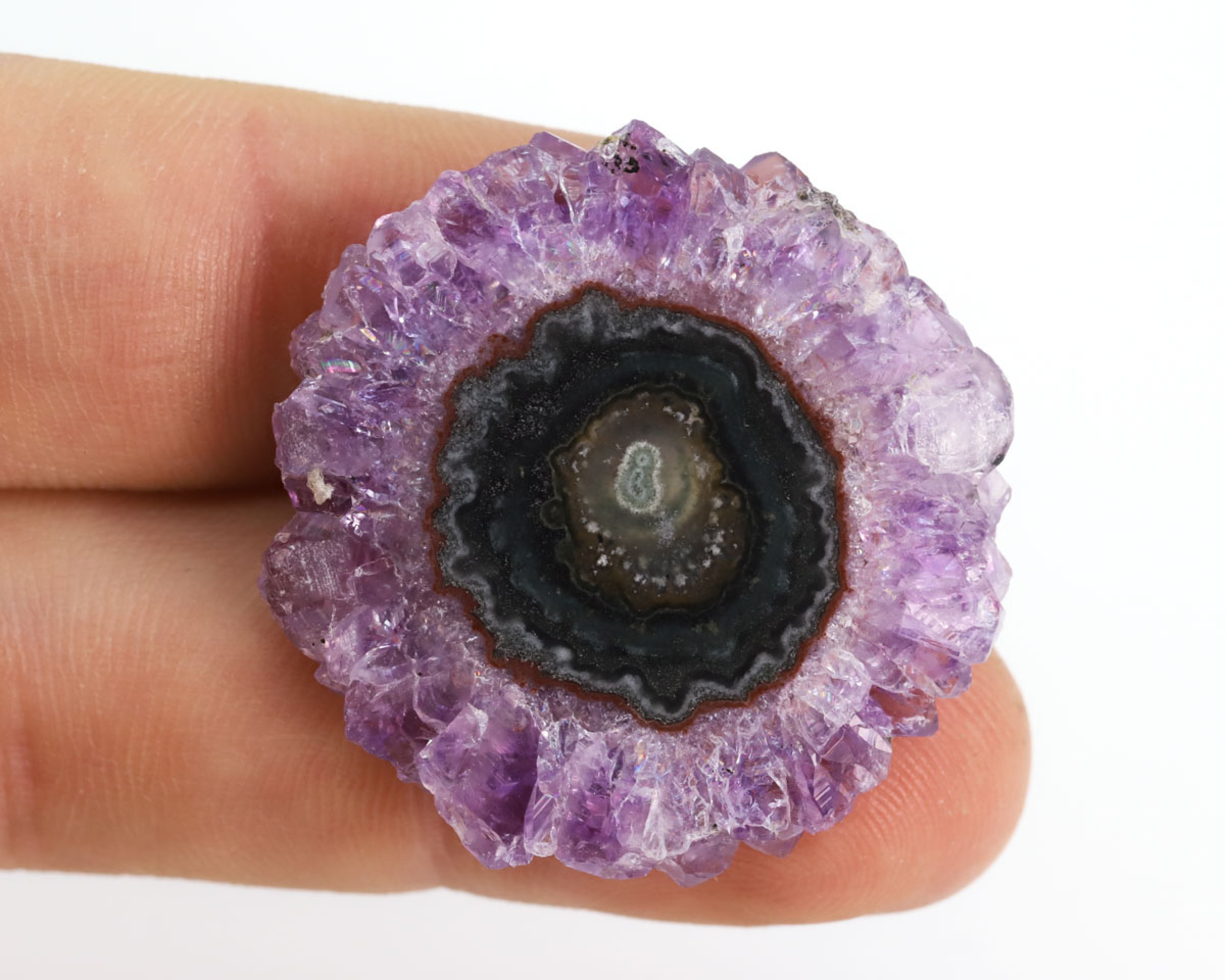 Płytka ametystowa wycięta ze stalaktytu, szlifowana i polerowana obustronnie. Plaster do oprawy jubilerskiej.