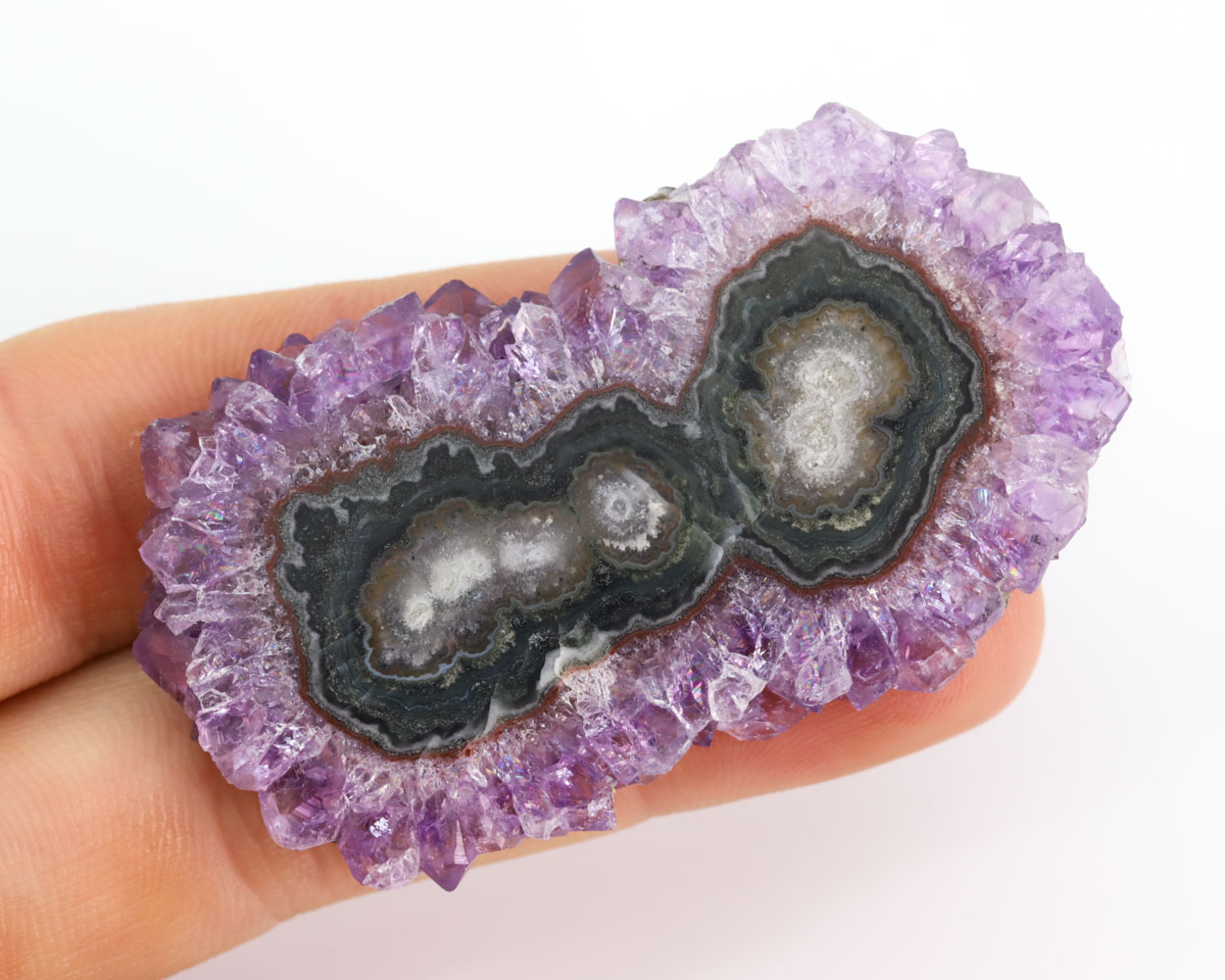 Płytka ametystowa wycięta ze stalaktytu, szlifowana i polerowana obustronnie. Plaster do oprawy jubilerskiej.