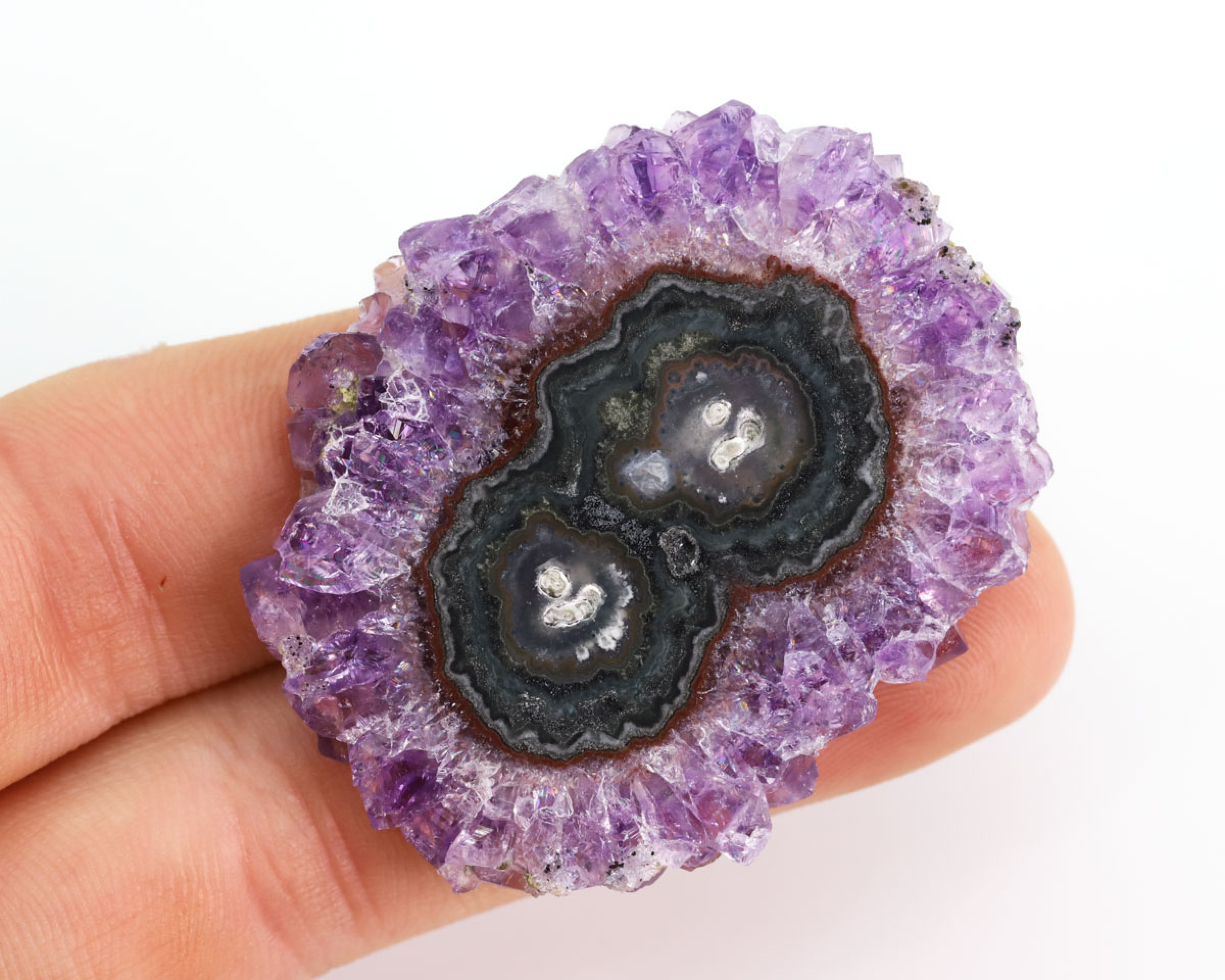 Płytka ametystowa wycięta ze stalaktytu, szlifowana i polerowana obustronnie. Plaster do oprawy jubilerskiej.