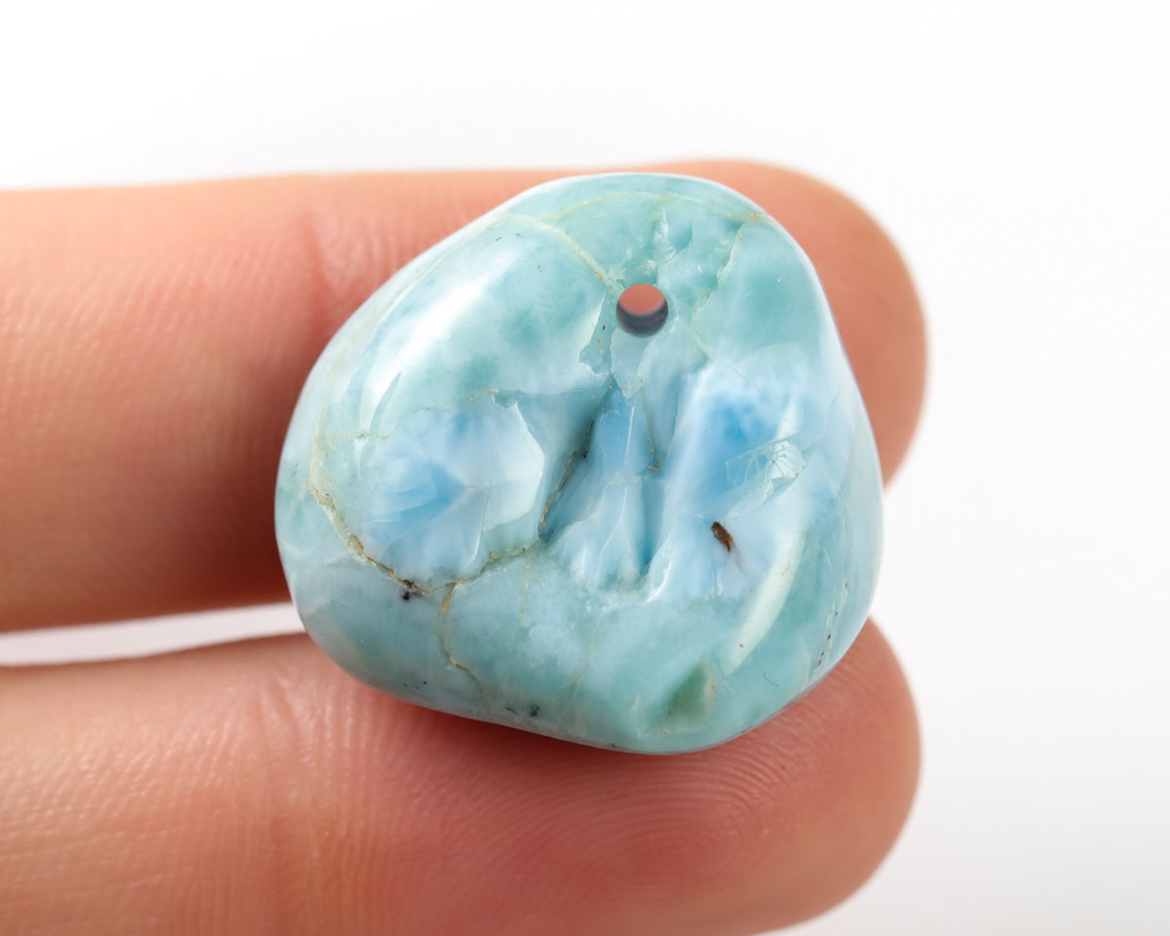 Naturalny Larimar w formie szlifowanego otoczaka z przewierconym otworem o średnicy 2mm.