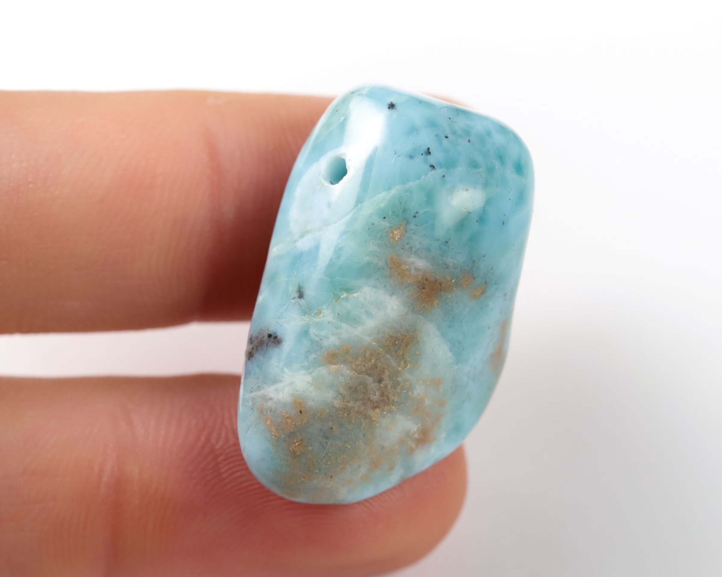Naturalny Larimar w formie szlifowanego otoczaka z przewierconym otworem o średnicy 2mm.